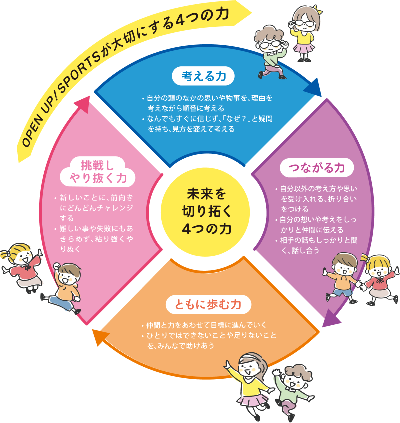 当スクールでは、特に「考える力」「ともに歩む力」「つながる力」「挑戦しやり抜く力」の4つを大切に、運動遊びを通してはぐくみます。